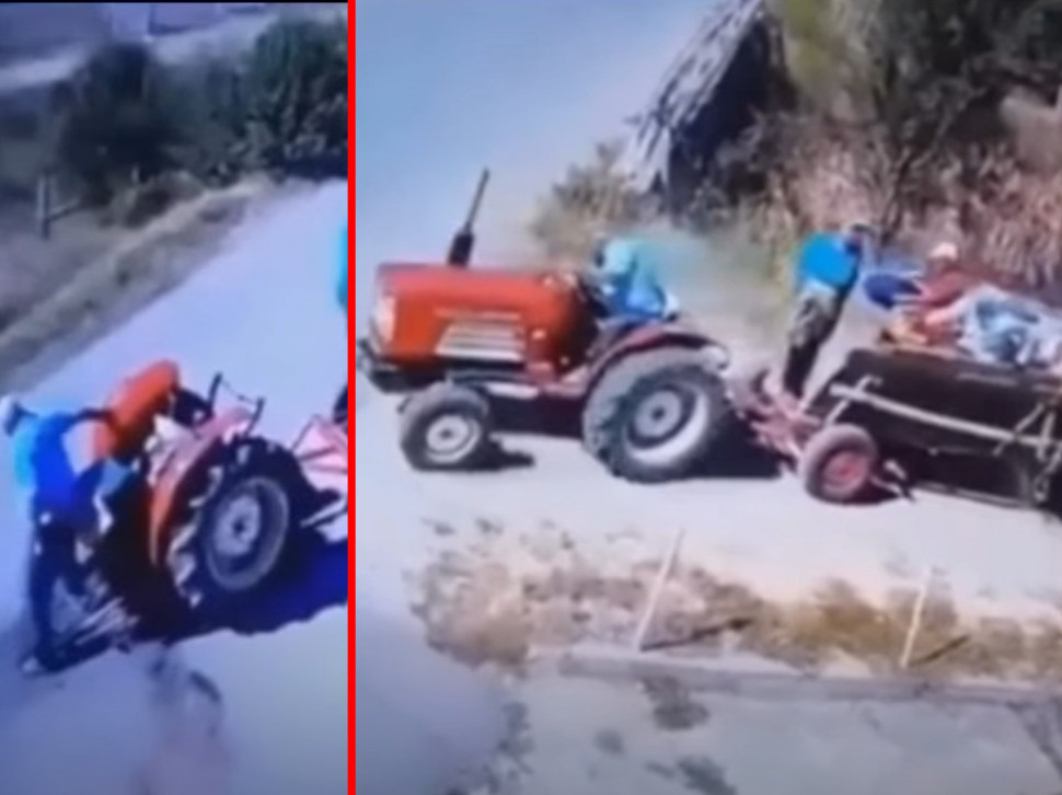 На снимку забележеном 2020. године (непознато тачно где), види се како је уплашени тракториста невероватном срећом прошао без икаквих последица - само је склизнуо са седишта и дочекао се на ноге.