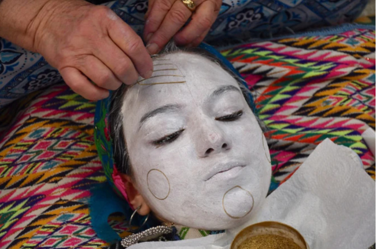 Пре церемоније, на лице девојке наноси се бела боја, а преко ње шаре различитих нијанси које имају симболична значења: црвени мотиви означавају плодност, плави штите од несреће, златни представљају фазе живота. Та посебна "маска" са раскошним украсима има функцију заштите невесте и њене будуће породице од урока, а чува је и од злих сила на дан венчања.