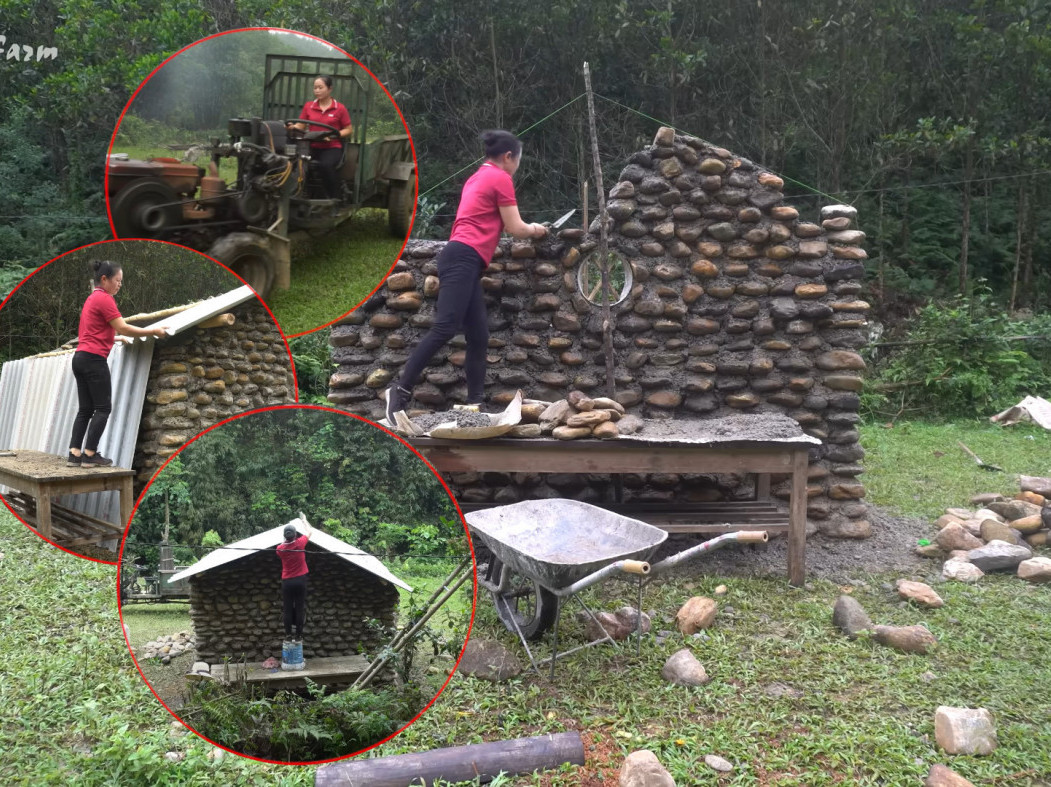 У убрзаном видеу Ксе трактором превози тешко речно камење из оближњег потока и користи га за изградњу камене куће дубоко у шуми.