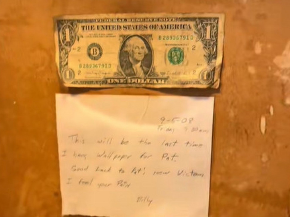 Док је Џаред скидао старе тапете, наишли су на детаљ који их је дословно зауставио. Испод слоја папира била је залепљена новчаница од једног долара, а испод ње комадић папира са руком писаном поруком из 2008. године.