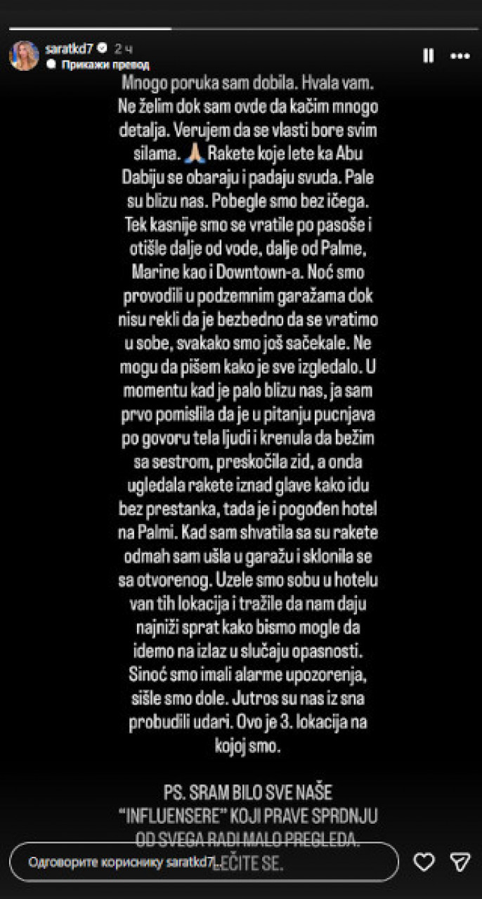 - Много порука сам добила. Хвала вам. Не желим док сам овде да качим много детаља. Верујем да се власти боре свим силама. Ракете које лете ка Абу Дабију се обарају и падају свуда. Пале су близу нас. Побегле смо без ичега. Тек касније смо се вратиле по пасоше и отишле даље од воде, даље од Палме, Марине као и Доwнтоwн - почела је Сара.