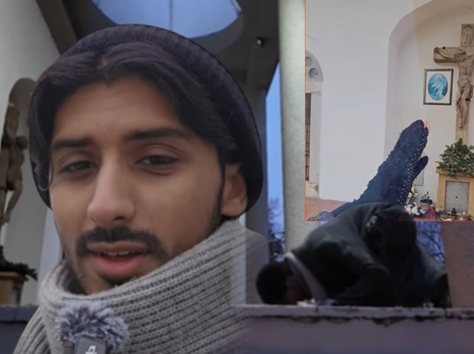 Снимак је помиритељског и едукативног тона, младић је снимао и дроном, а затим се молио испред цркве у наткривеном простору где се налази и крст са распетим Исусом.