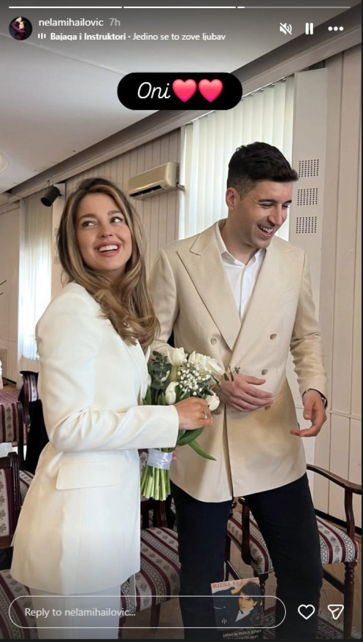 Нина Нешковић је са партнером судбоносно "да" изговорила најпре у општини, а блистала је у белом оделу, док је младожења имао крем сако и тамне панталоне.