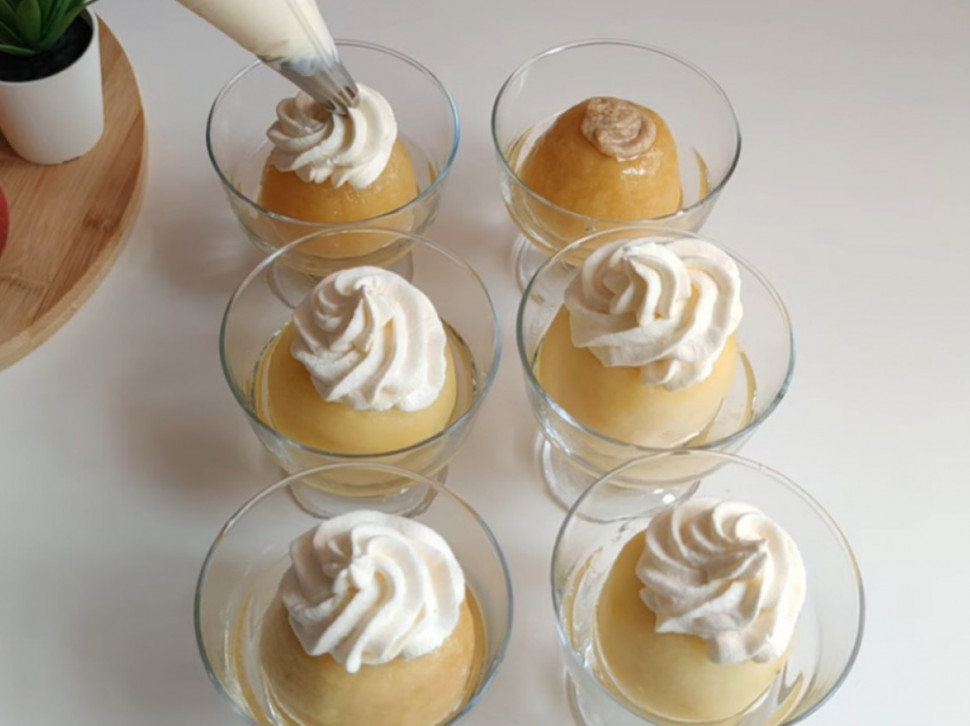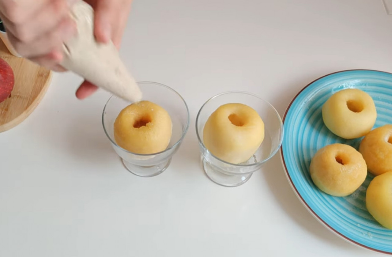 Ољуштите и издубите јабуке. Ставите их у прокључали шећер с водом и кувајте 10 минута. Орахе помешајте с умућеном слатком павлаком и напуните јабуке. Одозго ставите по кашику слатке павлаке. Декоришите туфахије по жељи.