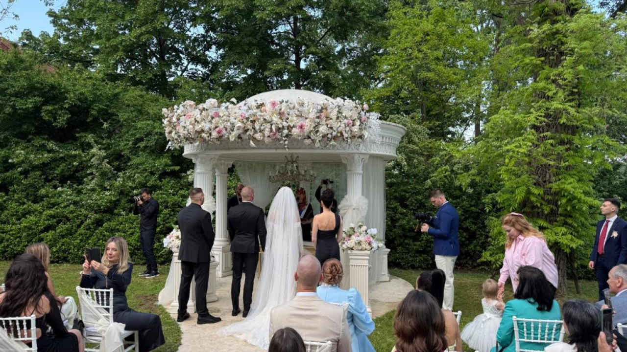 Певачица је очарала присутне у уникатној, ручно прављеној белој тоалети посутој кристалима, која је била дар модног креатора Бојана Петровића, док је њен изабраник Иван обукао префињени црни смокинг употпуњен лептир-машном.