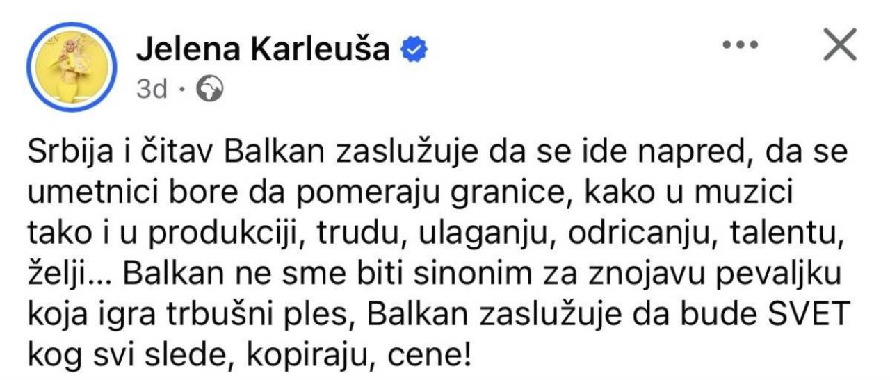 - Србија и читав Балкан заслужује да се иде напред, да се уметници боре да померају границе, како у музици, тако и у продукцији, труду, улагању, одрицању, таленту, жељи... Балкан не сме бити синоним за знојаву певаљку која игра трбушни плес, Балкан заслужује да буде свет ког сви следе, копирају, цене! - написала је Јелена на свом профилу, а многи у коментарима пишу да су се увреде односиле на Теу Таировић, са којом је певачица већ годинама у естрадном рату.