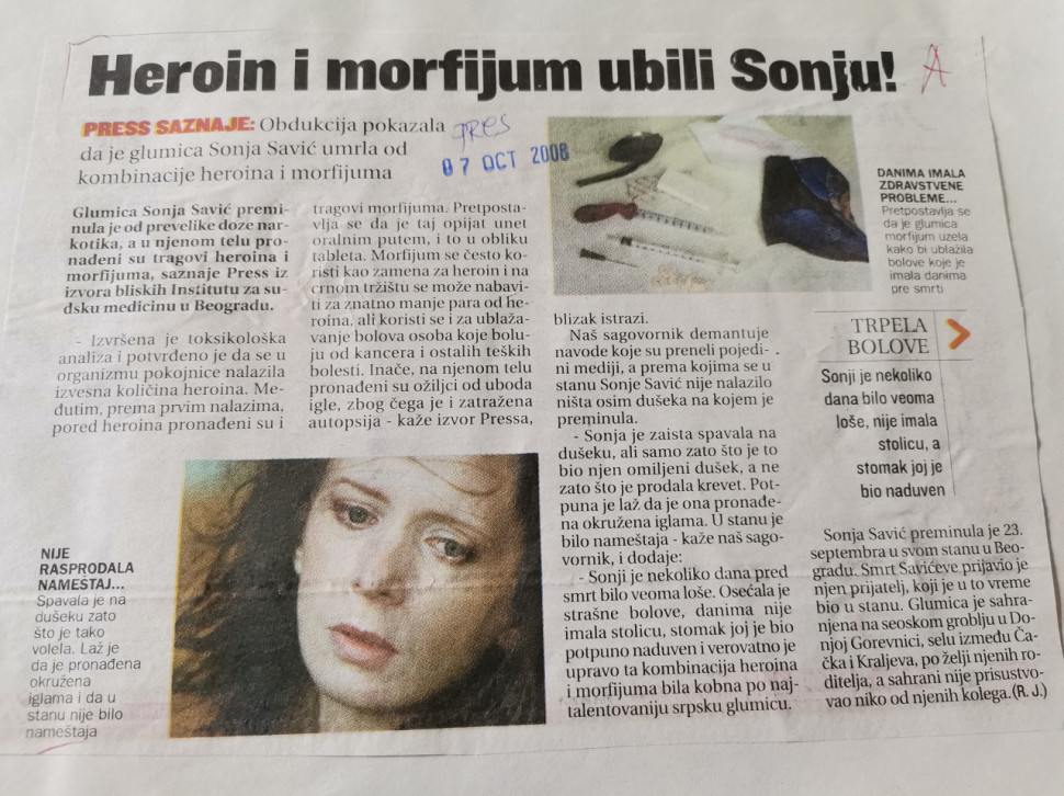 "Узрок смрти глумице Соње Савић (47) која је преминула прошлог уторка је превелика доза хероина, показала је обдукција коју је обавио Институт за судску медицину у Београду."