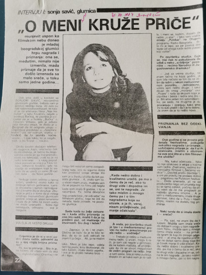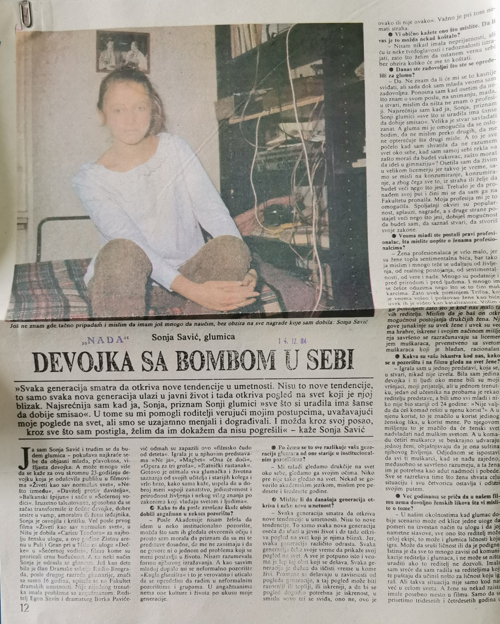 - Ја сам Соња Савић и трудим се да будем глумица - покушава најкраће себе да објасни млада, плавокоса, вижљаста девојка. А може много више да се каже за ову скромну 23-годишњу девојку која је одушевила публику у филмовима 'Живети као сав нормалан свет', 'Нешто између', 'Давитељ против давитеља', 'Балкански шпијун' и сада у 'Шећерној водици.' (Архив Борбе, Нада, 14. 12. 1984.)