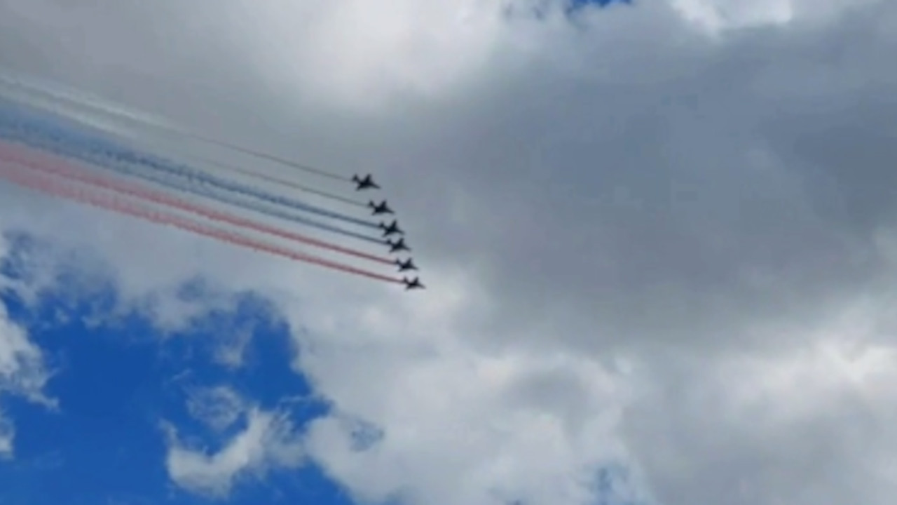 Ваздушну пробу завршило је девет ловаца акробатских тимова Руски витезови и Стрижи у формацији Кубански дијамант и шест јуришних авиона Су-25, који ће на дан параде обојити небо у боје руске тробојке.