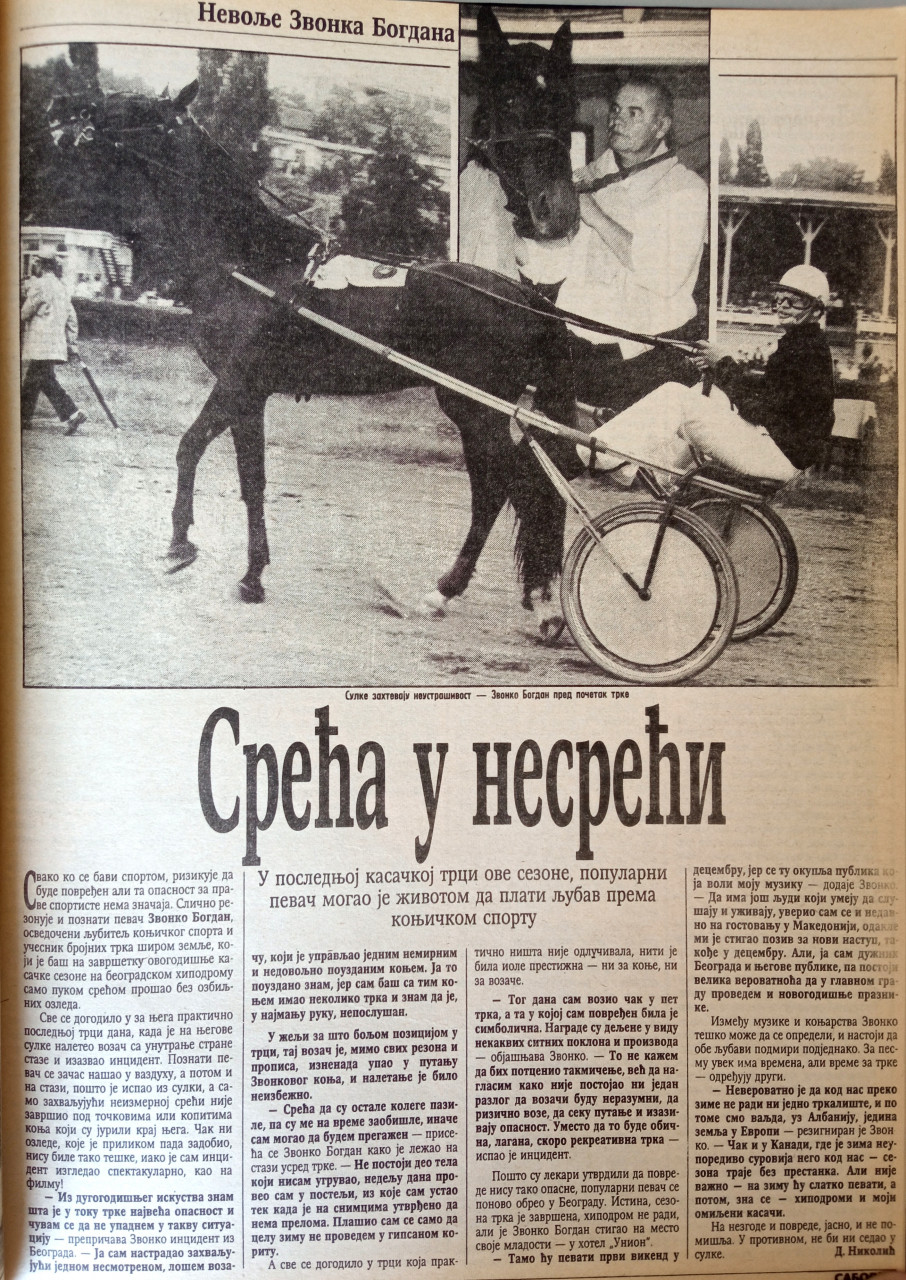 Свако ко се бави спортом ризикује да буде повређен али та опасност за праве спортисте нема значаја. Слично резонује и познати певач Звонко Богдан, осведочени љубитељ коњичког спорта и учесник бројних трка широм земље, који је баш на завршетку овогодишње касачке сезоне на београдском хиподрому само пуком срећом прошао без озбиљних озледа.