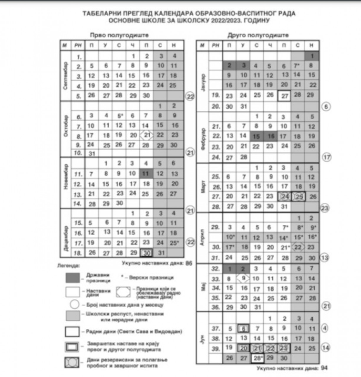 Како се види на поменутом Календару, прво полугодиште за основце почиње 1. септембра 2022. године, односно у четвртак, а завршава се у петак 30. децембра 2022. године.