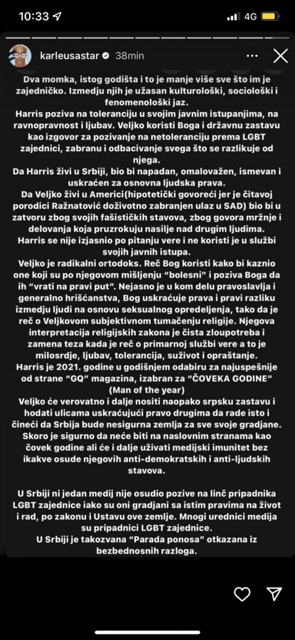 - Нејасно је у ком делу православља и генерално хришћанства Бог ускраћује права и прави разлику између људи на основу сексуалног опредељења, тако да је реч о Вељковом субјективном тумачењу религије. Његова интерпретација религијских закона је чиста злоупотреба и замена теза када је реч о примарној служби вере а то је милосрђе, љубав, толеранција, суживот и опраштање. Харис је 2021. године у годишњем одабиру за најушпеније од стране "GQ" магазина, изабран за "Човека године". Вељко ће вероватно и даље носити наопако српску заставу и ходати улицама ускраћујући право другима да раде исто и чинећи да Србија буде несигурна земља за све своје грађане. Скоро је сигурно да неће бити на насловним странама као човек године али ће и даље уживати медијски имунитет без икакве осуде његових анти-демократских и анти-људских ставова. У Србији ни један медиј није осудио позиве на линч припадника ЛГБТ заједнице иако су он грађани са истим правима на живот и рад, по закону и Уставу ове земље. Многи уредници медија су припадници ЛГБТ заједнице. У Србији је такозвана "Парада поноса" отказана из безбедносних разлога - написала је Карлеуша.