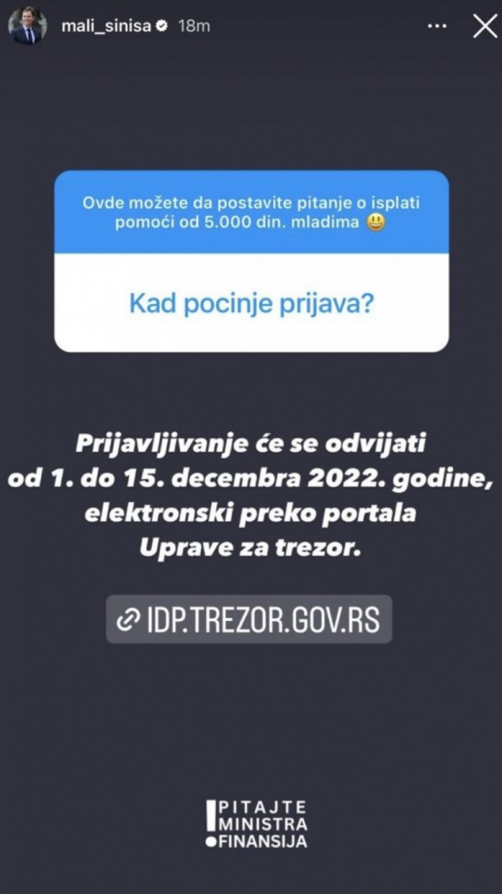 -Пријављивање ће се одвијати од 1. до 15. децембра 2022. године, електронски преко портала Управе за трезор- одговорио је министар Синиша Мали на питање кад почиње пријава.
