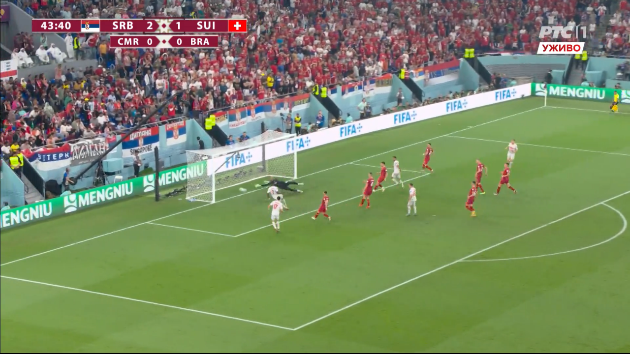 Соу је из казненог простора додао лопту на десно крило Видмеру, а овај идеално, по земљи, иза леђа затечене одбране Србије проиграо Брила Ембола, који је други пут на Мундијалу постигао погодак, сада за изједначење.