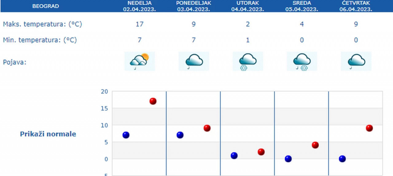 А онда од недеље обрт - температура нагло пада, у Београду рецимо, где је сутра прогнозирано максимум 17 степени, у понедељак ће бити свега 9, а у уторак још мање - само 2 степена Целзијусових.