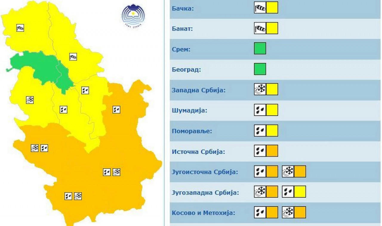 Време ће бити "опасно", односно на снази је наранџасти метеоаларм, у следећим крајевима Србије: Источна (због кише), Југоисточна (киша, снег или лед), Југозападна Србија (снег или лед - наранџасти, за кишу жути ), као и на подручју КиМ (киша, снег или лед).