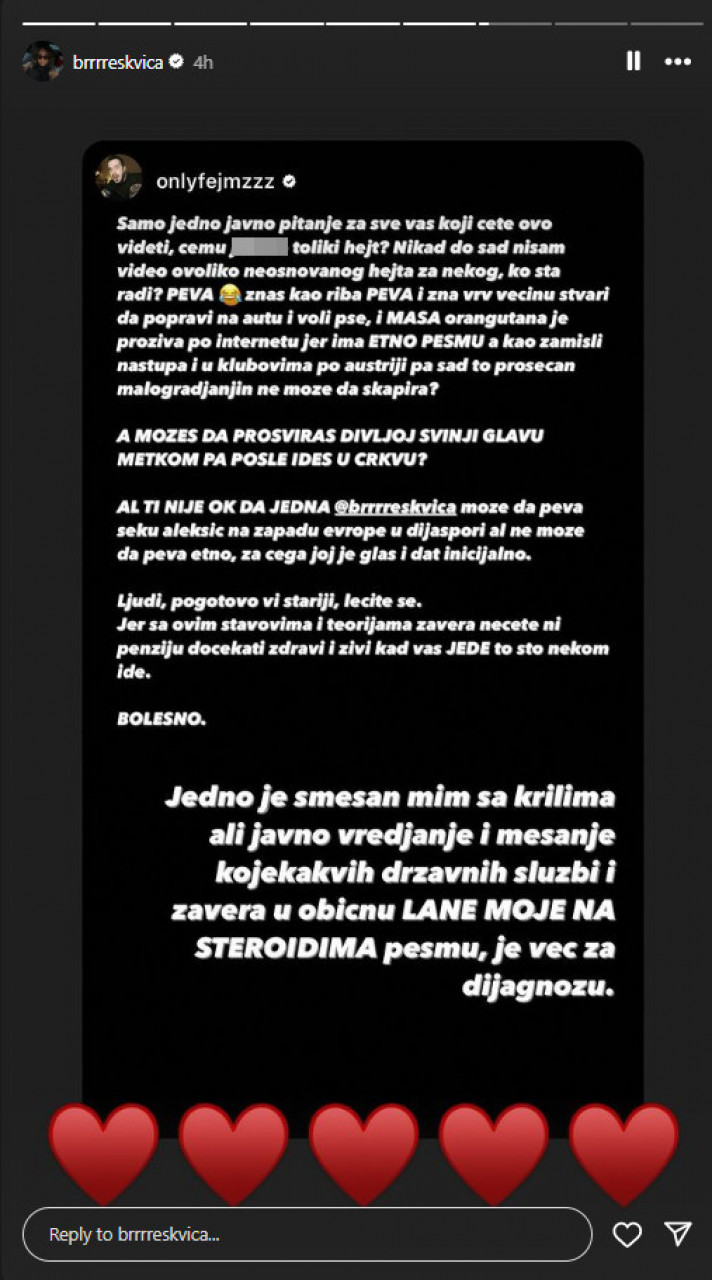 - Само једно јавно питање за све вас који ћете ово видети, чему толики хејт? Никад до сад нисам видео оволико неоснованог хејта за неког, ко шта ради? Пева! Знаш као риба пева и зна вероватно већину ствари да поправи на ауту и воли псе, и маса орангутана је прозива по интернету јер има етно песму. Као, замисли наступа и у клубовима по Аустрији па сад то просечан малограђањин не може да скапира? А можеш да просвираш дивијој свињи главу метком, па после идеш у цркву? Али ти није ок да једна Бресквица може да пева Секу Алексић на западу Европе у дијаспори, али не може да пева етно, за чега јој је глас и дат иницијално. Људи, поготово ви старији, лечите се, јер са овим ставовима и теоријама завера нећете ни пензију дочекати здрави и живи кад вас једе то што неком иде. Болесно! Једно је смешан мим са крилима, али јавно вређање и мешање којекаквих државних служби и завера у обичну "Лане моје" на стероидима песму, је већ за дијагнозу - стоји у објави коју је поделила Бресквица.