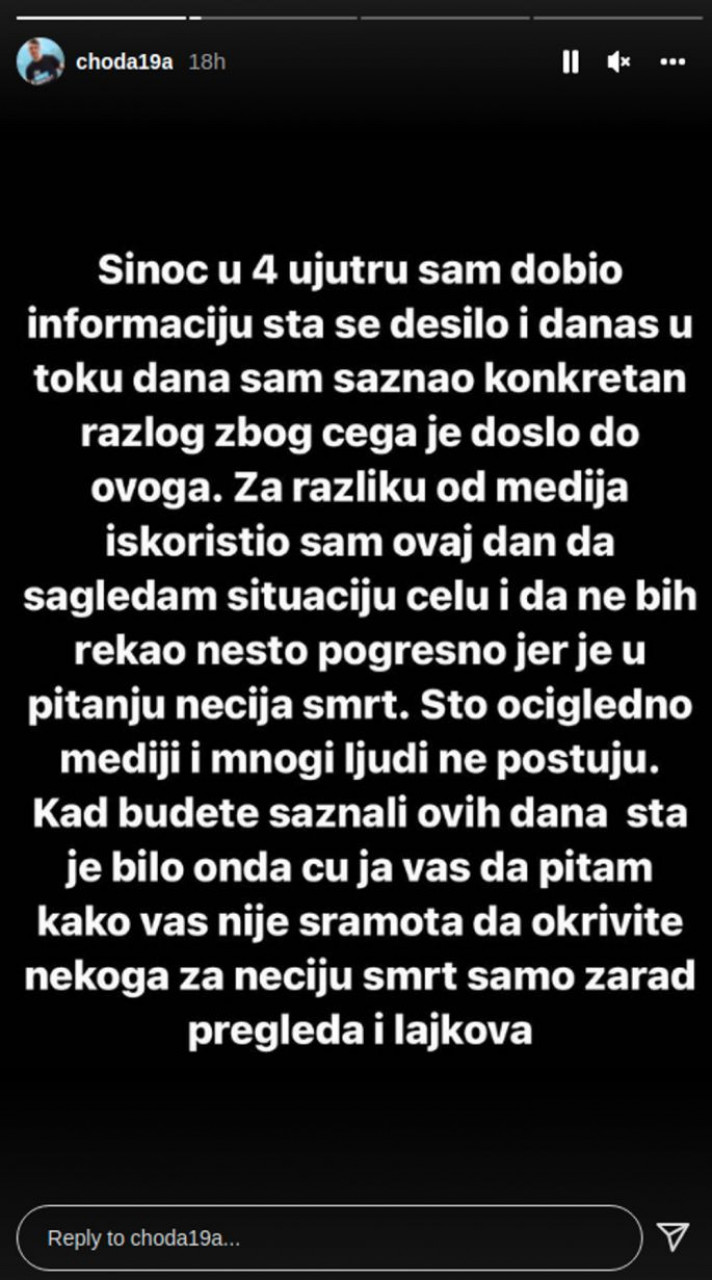 - У 4 ујутру добио сам информацију шта се десило и данас у току дана сам сазнао конкретан разлог због чега је дошло до овога. Искористио сам овај дан да сагледам целу ситуацију и да не бих рекао нешто погрешно јер је у питању нечија смрт. Када будете сазнали ових дана шта је било, онда ћу ја вас да питам како вас није срамота да окривите некога за нечију смрт само зарад прегледа и лајкова - објаснио је Данило Бадњар, а потом изјавио саучешће породици.