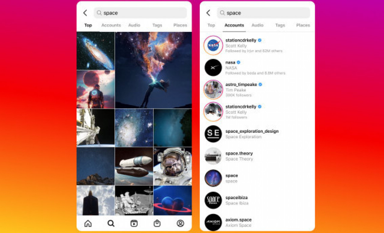 Рецимо да сте заинтересовани да пронађете слике свемира након што видите плави месец. Када додирнете траку за претрагу на страници "search", прва ствар коју видите су недавне претраге. Када почнете да куцате „space“, Инстаграм вам приказује налоге, аудио записе, хаштагове и места која одговарају тексту ваше претраге.
