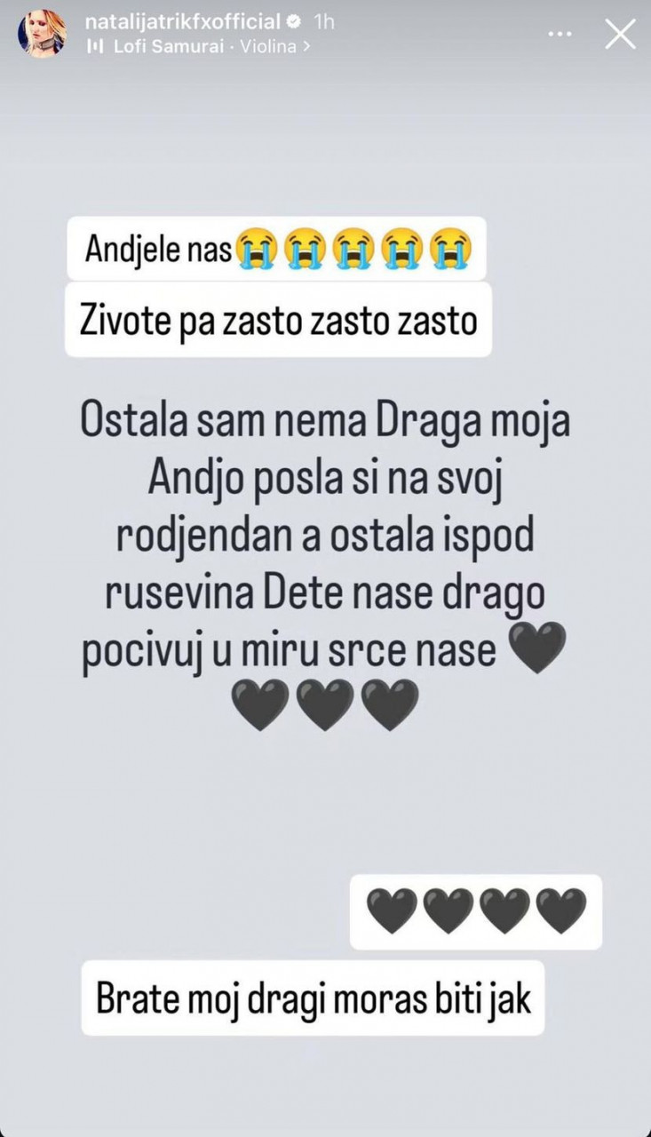 - Анђеле наш, животе, па зашто, зашто, зашто? Остала сам нема драга моја, Анђо, пошла си на рођендан, а остала испод рушевина, дете наше драго. Почивај у миру, срце наше - написала је Наталија и додала: