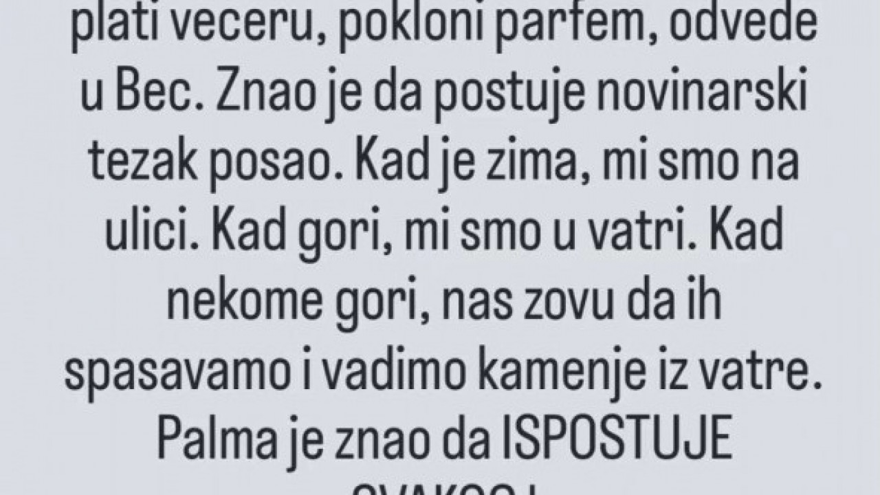 "Палма је био један од ретких политичара који је знао да испоштује новинаре, да плати вечеру, поклони парфем, одведе у Беч. Знао је да попштује новинарски тежак посао. Кад је зима, ми смо на улици. Кад гори, ми смо у ватри. Кад некоме гори, нас зову да их спасавамо и вадимо камење из ватре. Палма је знао да испоштује сваког!"