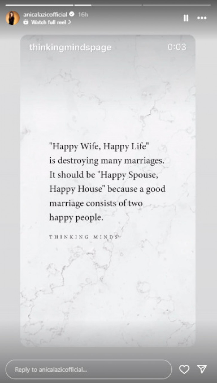 - Срећна жена, срећан живот - изрека која је уништила многе бракове. Требало би да гласи срећни супружници, срећна кућа, јер је добар брак сачињен од двоје срећних људи, стоји у објави коју је поставила на своје мреже.