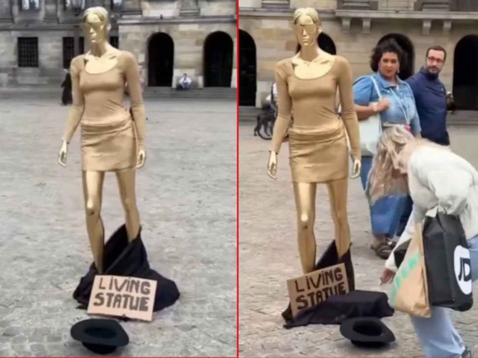 Nabavili su lutku nalik onima iz izloga butika, pažljivo je obukli, dodali naočare i obojili je zlatnim sprejom. Plan je bio jednostavan, postavili su lutku na prometnom trgu jedne popularne turističke destinacije, stavili natpis "živa statua" i postavili šešir ispred nje. Aludirali su na ulične umetnike koji na ovaj način zarađuju od prolaznika.