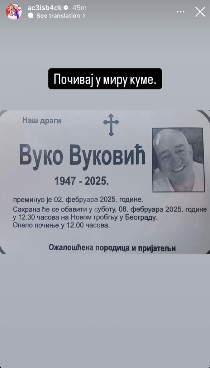 Vuko Vuković, kum Željka Ražnatovića Arkana, preminuo je 2. februara, a tužnu vest o njegovoj smrti na društvenim mrežama podelio je Veljko Ražnatović. Danas je na Novom groblju u Beogradu održana i sahrana pokojnog Vukovića.