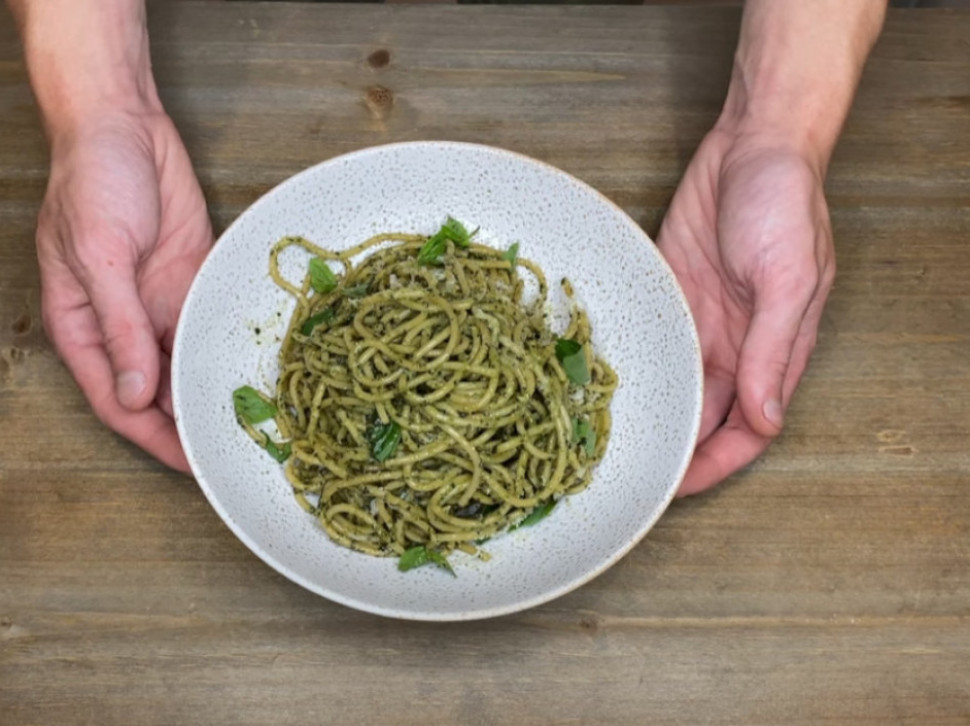 Za početak u blenderu usitnite bosiljak, beli luk, orahe, parmezan, so i biber. Malo po malo dodajte maslinovo ulje, a kada primetite da smesa postaje homogena i kao pesto, to znači da ste na dobrom putu. Prokuvajte vodu sa solju pa skuvajte testeninu po uputstvu sa kesice, da bude al dente. Posle toga u veliku šerpu stavite pesto sos pa umešajte kuvanu testeninu i mešajte dok se testenina dobro ne premaže pestom. Po potrebi dodajte malo vode. Pospite pastu parmezanom i svežim bosiljkom.