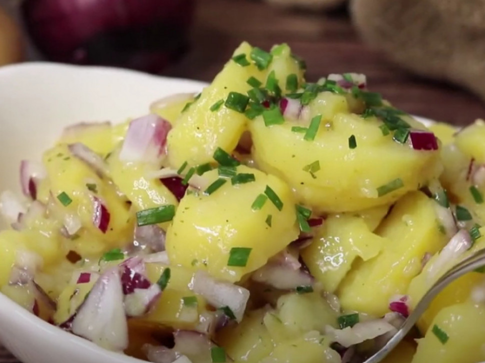 Oljuštite krompir, pa ga kuvajte pola sata. Potom ga ostavite u hladnoj vodi i isecite na kriške. Posle toga iseckajte crni luk, pa dodajte krompiru i promešajte. Dodajte vodu, ulje,sirće i senf, dobro sjedinite pa prelijte reko krompira. Ostavite da odstoji pola sata, pa posle toga dekorišite seckanim peršunom, dodajte so i biber. Salata je spremna za služenje.