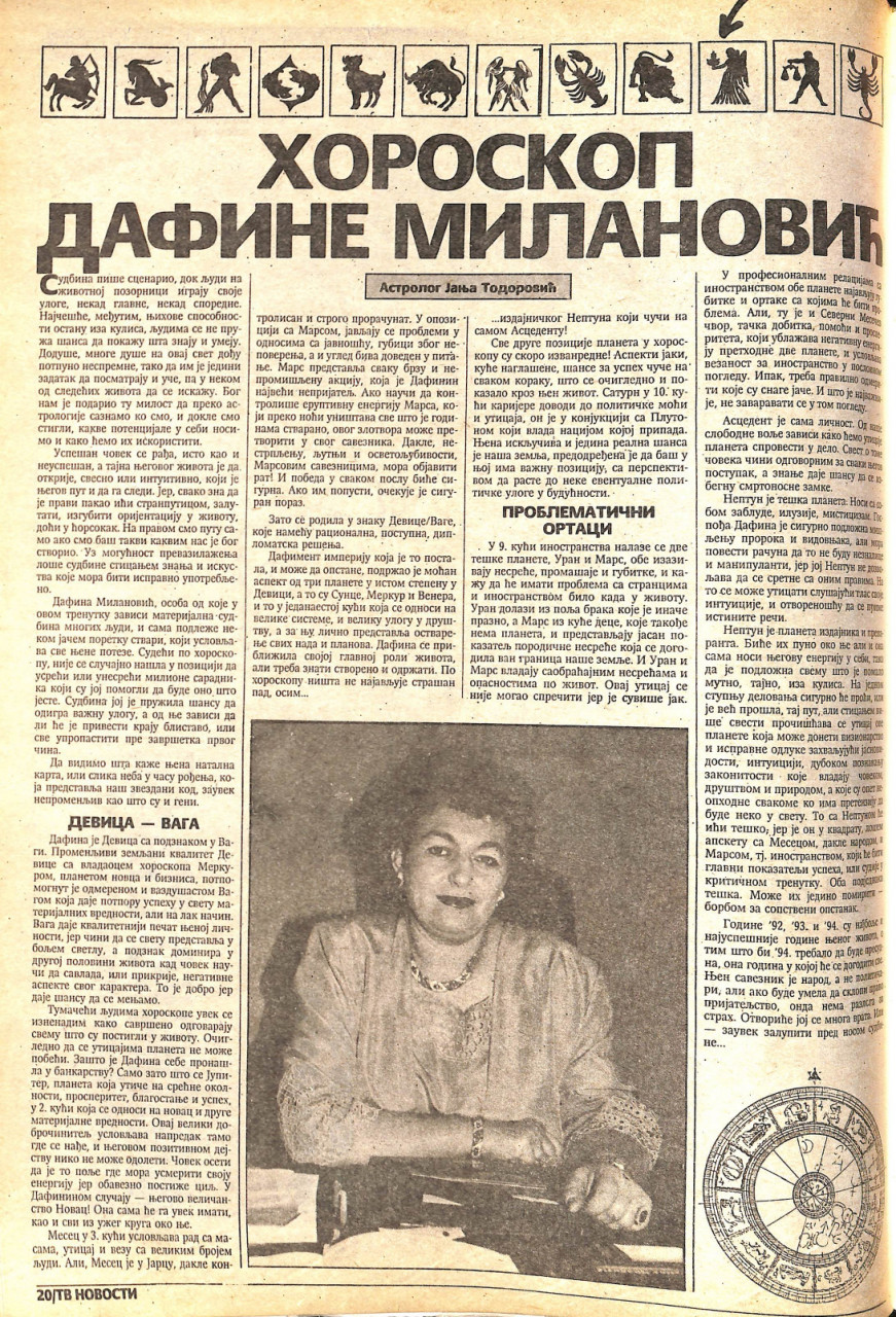 Astrološkinja je istakla da će za Dafinu "godine '92, '93, i '94 biti najbolje i najuspešnije godine njenog života, s tim što bi '94 trebalo da bude presudna, ona godina u kojoj će se dogoditi sve". Tekst koji je izašao u aprilu 1993. godine "Nportal.rs" pravo iz arhive "Novosti" prenosimo u celosti: