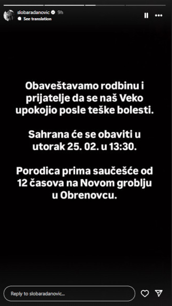 - Obaveštavamo rodbinu i prijatelje da se naš Veljko upokojio posle teške bolesti. Sahrana će se obaviti u utorak 25.2. u 13:30 - obavestio je pevač svoje poznanike.