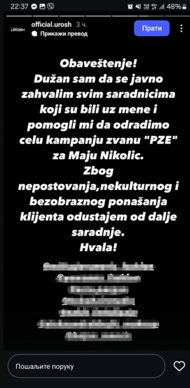- Obaveštenje, dužan sam da se javno zahvalim svim saradnicima koji su bili uz mene i pomogli mi da odradimo celu kampanju zvanu "PZE" za Maju Nikolić.