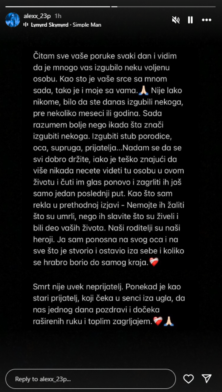 - Čitam sve vaše poruke svaki dan i vidim da je mnogo vas izgubilo neku voljenu osobu. Kao sto je vaše srce sa mnom sada, tako je i moje sa vama. Nije lako nikome, bilo da ste danas izgubili nekoga, pre nekoliko meseci ili godina. Sada razumem bolje nego ikada šta znači izgubiti nekoga. Izgubiti stub porodice, oca, supruga, prijatelja... Nadam se da se svi dobro držite, iako je teško znajući da više nikada nećete videti tu osobu u ovom životu i čuti im glas ponovo i zagrliti ih još samo jedan poslednji put, napisala je Aleksandra i naglasila: