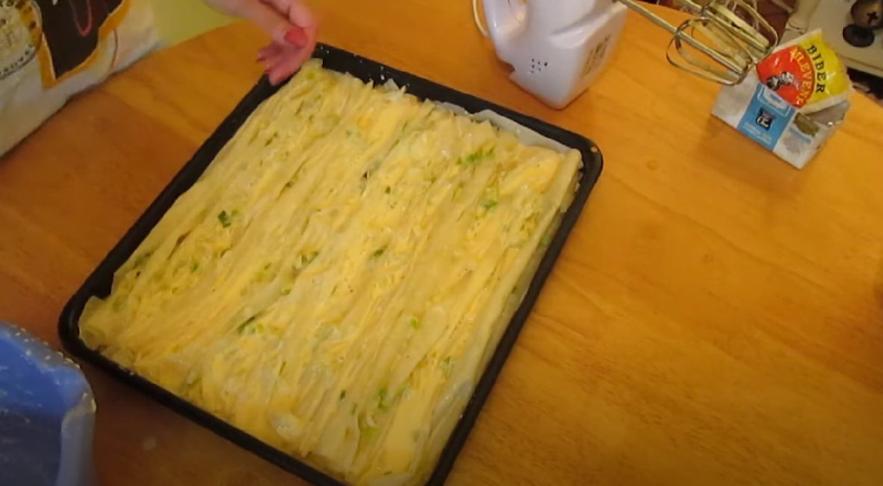 Za početak, zagrejte maslac ili ulje u tiganju, dodajte luk i beli luk i pržite dok ne dobiju zlatno žutu boju. Potom dodajte iseckane šampinjone i pržite dok ne omekšaju i dok tečnost ne ispari. Posolite i pobiberite po ukusu. Razvucite lisnato testo na radnoj površini i podelite ga na dva dela. Na prvi deo testa stavite smesu od pečuraka, pospite rendanim kačkavaljem, pa prekrijte drugim delom testa. Premažite površinu premazom od maslaca ili ulja. Pitu je potrebno peći 25 do 30 minuta u prethodno zagrejanoj rerni na 180 stepeni.