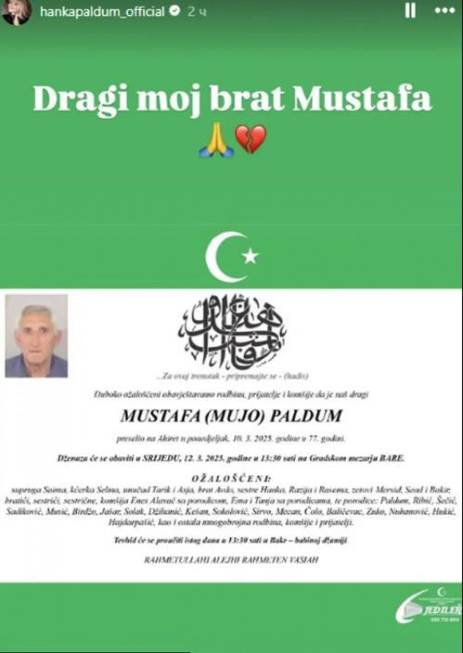- Dragi moj brat Mustafa - napisala je ona u objavi a pored je stajalo slomljeno srce i ruke u molitvi i objavljena umrlica.