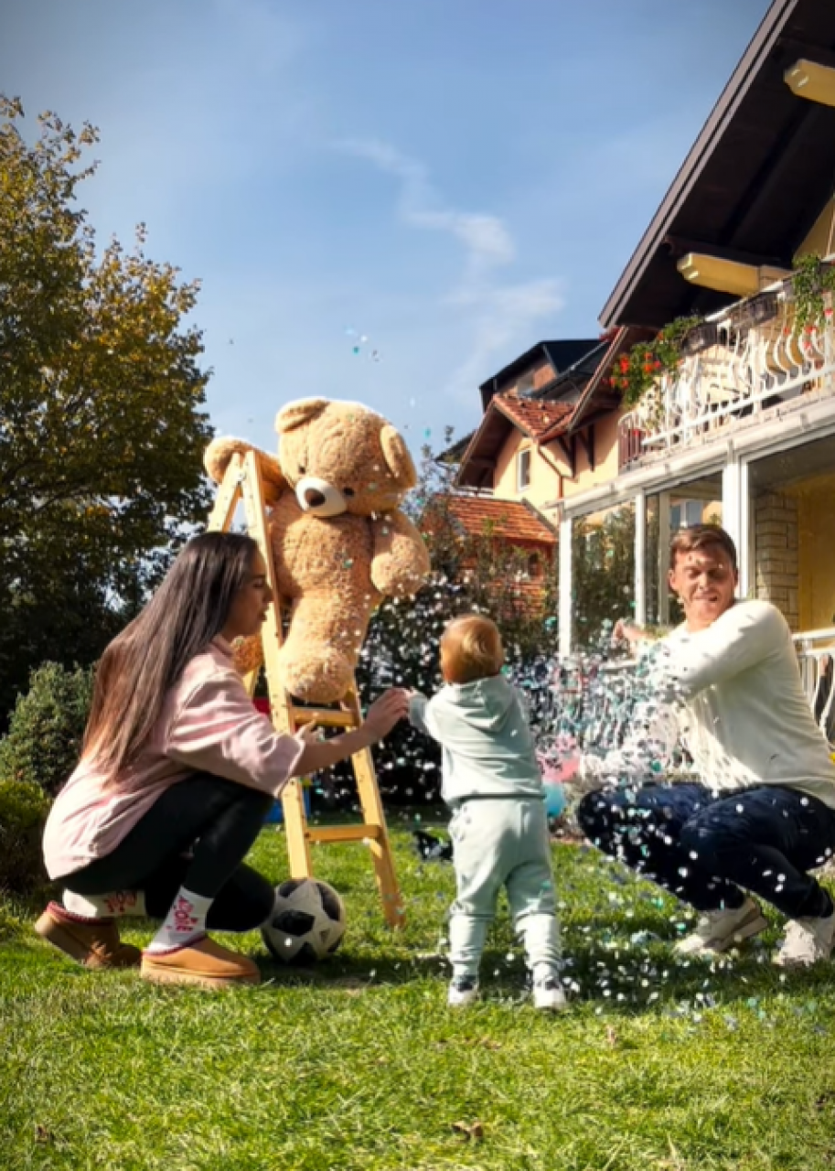 Supružnici su u dvotrištu kuće napravili manju zabavu i zajedno sa sinom probušili balon iz kog su izletele plave konfete, što znači da stiže još jedan dečak.