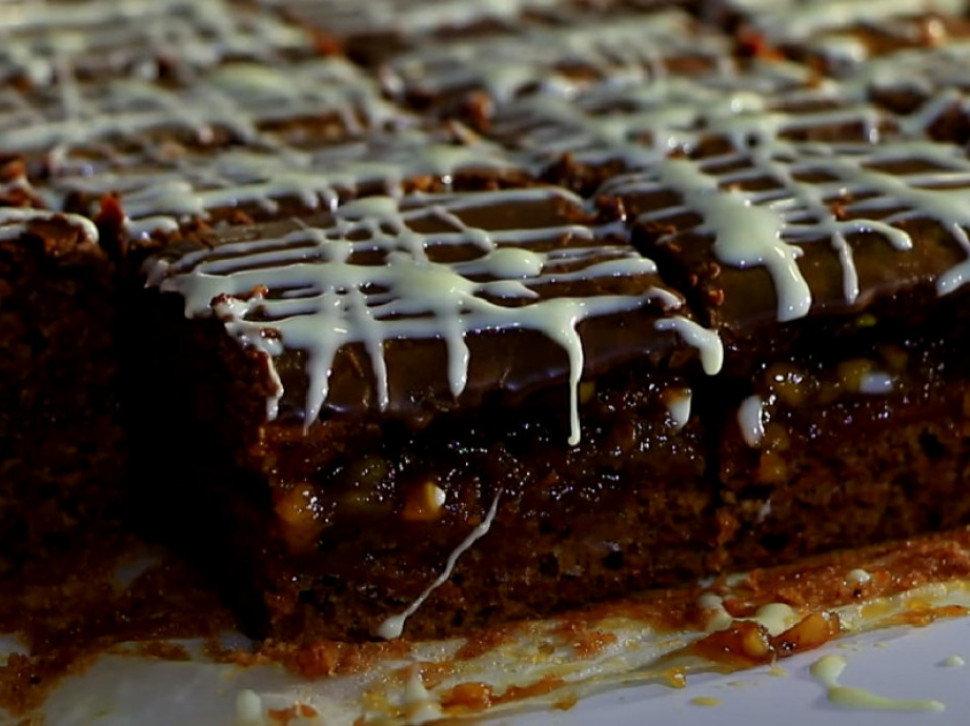 Rernu zagrejte na 200 stepeni. U jednoj posudi pomešajte brašno, kakao, sodu bikarbonu i cimet. Zasebno sjedinite kiselu vodu, ulje, šećer i tri kašike džema, pa dodajte suve sastojke. Mikserom sjedinite, pa sipate u pleh obložen papirom za pečenje. Pecite oko pola sata, u rerni zagrejanoj na 200 stepeni. Preostalim džemom premažite vruć kolač. Na pari otopite čokoladu sa uljem. Glazurom prelijte prohlađen kolač. Pospite seckanim bademom.