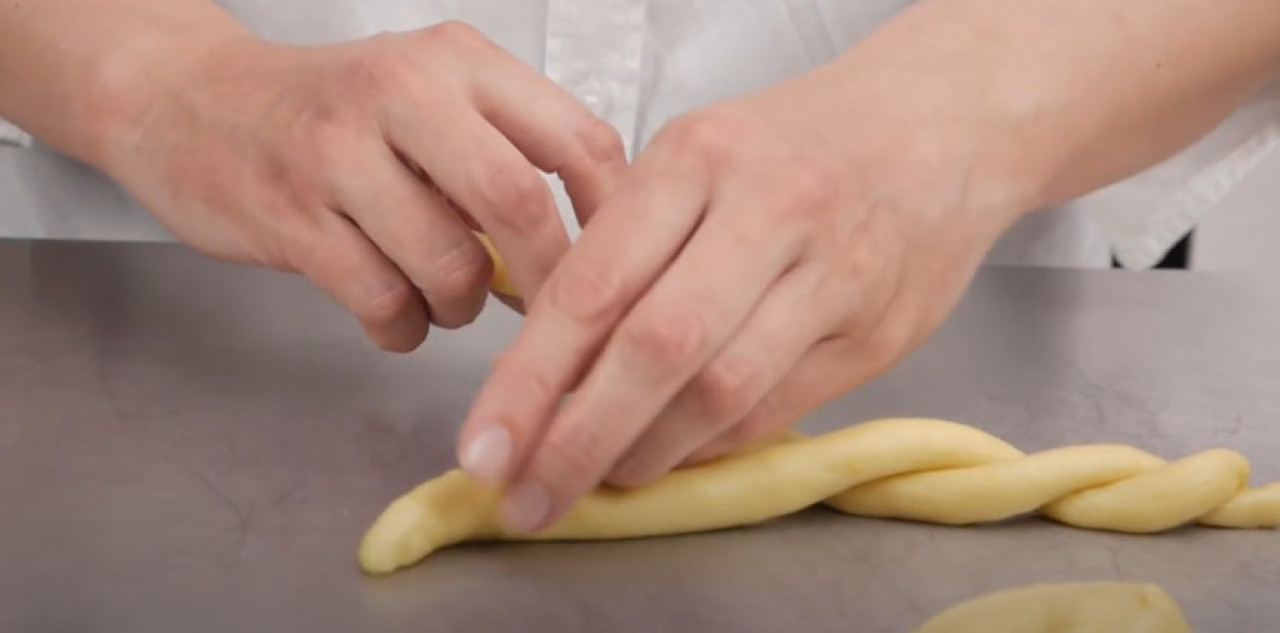 Rernu zagrejte na 180 stepeni. Kvasac rastvorite u mlakom mleku sa kašičicom šećera. Pustite da se aktivira nekih sedam minuta. U jednoj velikoj posudi sjedinite brašno, preostali šećer i so. Umešajte nadošli kvasac i umućena jaja, pa mesite pet minuta. Polako dodajte maslac, uz neprestano mešanje, dok ne dobijete meko, glatko testo. Stavite u nauljenu činiju, pa pokrijte i ostavite dva sata na toplom. Na pobrašnjenoj radnoj površini podelite testo na tri dela. Svaki razvucite u dugačku traku. Zatim, isecite tri "konopca", pletenicu upletite i spojite krajeve u oblik venčića. Stavite na pleh obložen papirom za pečenje, pa utisnite obojena jaja između pletenica. pokrijte i pustite da naraste još pola sata. Premažite pogaču umućenim jajetom i pospite šarenim mrvicama. Pecite pogaču 25 do 30 minuta, u rerni zagrejanoj na 180 stepeni.