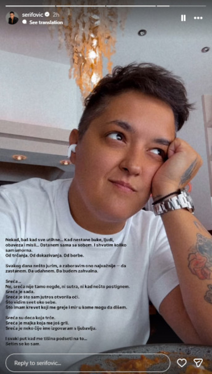 - Ne, sreća nije tamo negde, ni sutra, ni kad nešto postignem. Sreća je sada. Sreća je sto sam jutros otvorila oči. Što vidim svet oko sebe. Što imam krevet koji me greje i mir u kome mogu da dišem. Sreća su deca koja trče. Sreća je majka koja me još grli. Sreća je neko čije ime izgovaram s ljubavlju. I svaki put kad me tišina podseti na to... Setim se ko sam- poručila je Šerifović.