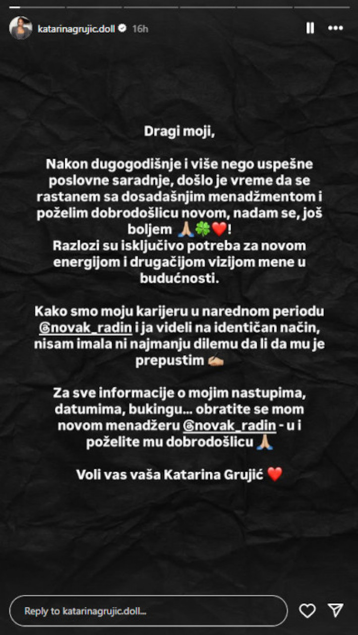 - Kako smo moju karijeru u narednom periodu Novak Radin i ja videli na identičan način nisam imala ni najmanju dilemu da li da mu je prepustim. Za sve informacije o mojim nastupima, datumima, bukingu… Obratite se mom novom menadžeru i poželite mu dobrodošlicu. Voli vas vaša Katarina Grujić - istakla je pevačica u svom saopštenju.