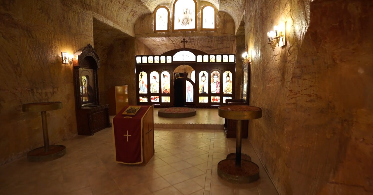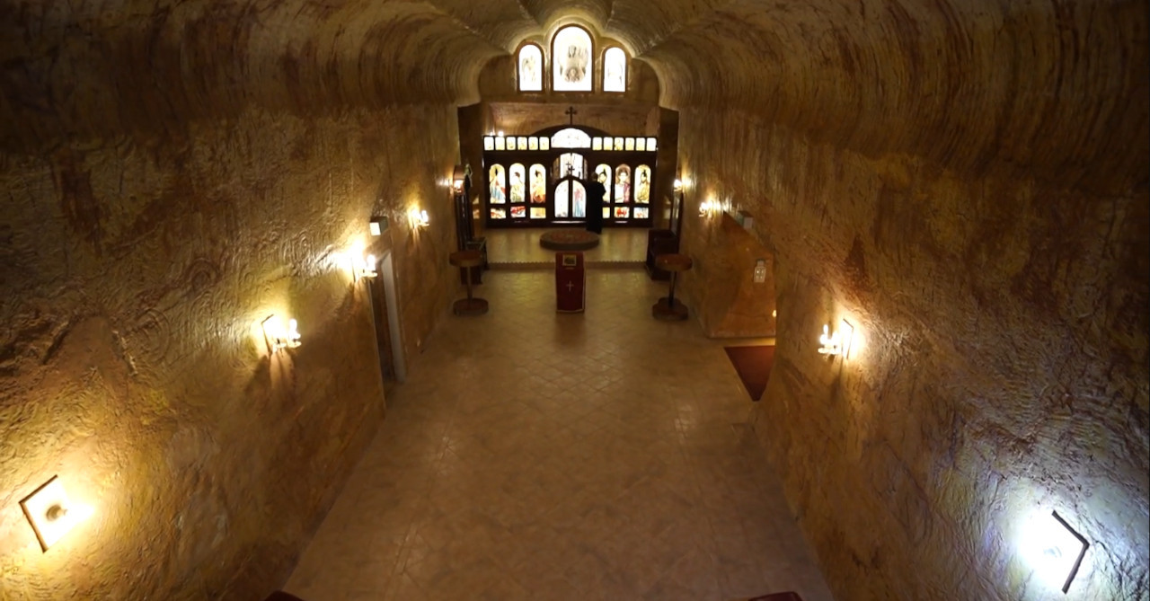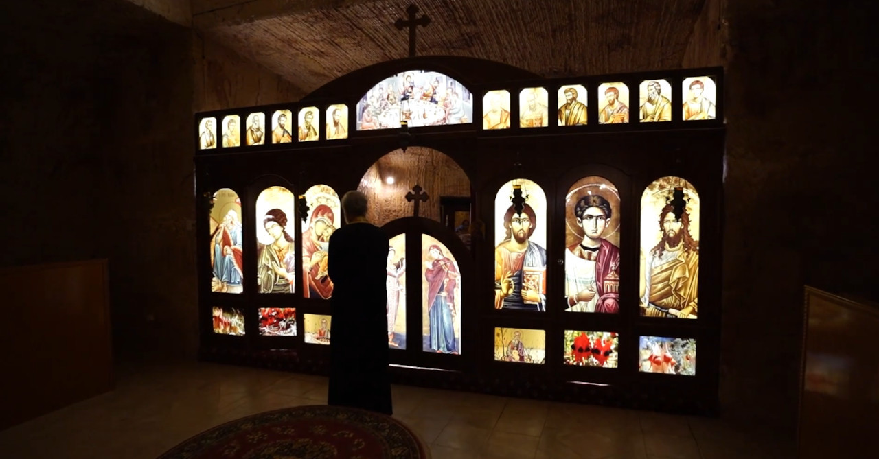 Ikonostas podzemne pravoslavne crkve čini vitraž kroz koji dopire svetlost koja obasjava u zidovima uklesane freske i statue svetaca.