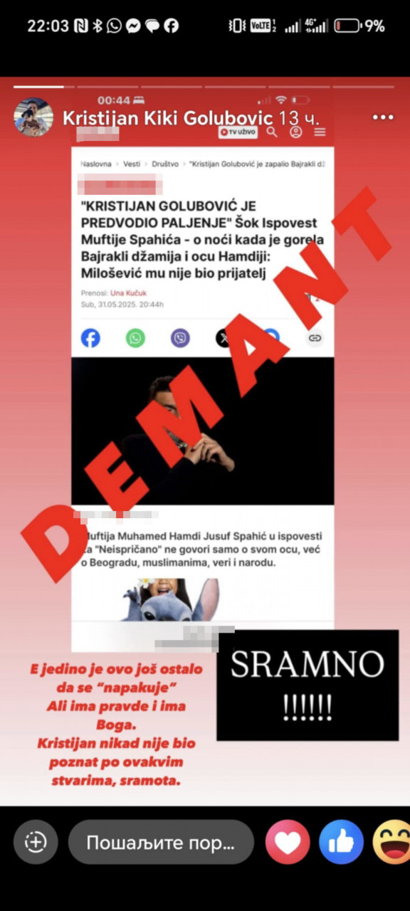 U objavama se jasno ističe da su, kako tvrde, informacije plasirane u medijima potpuno neosnovane, da ne postoji nijedan dokaz, niti je Kristijan ikada bio poznat po takvim delima, niti optuživan, niti procesuiran za bilo šta slično.