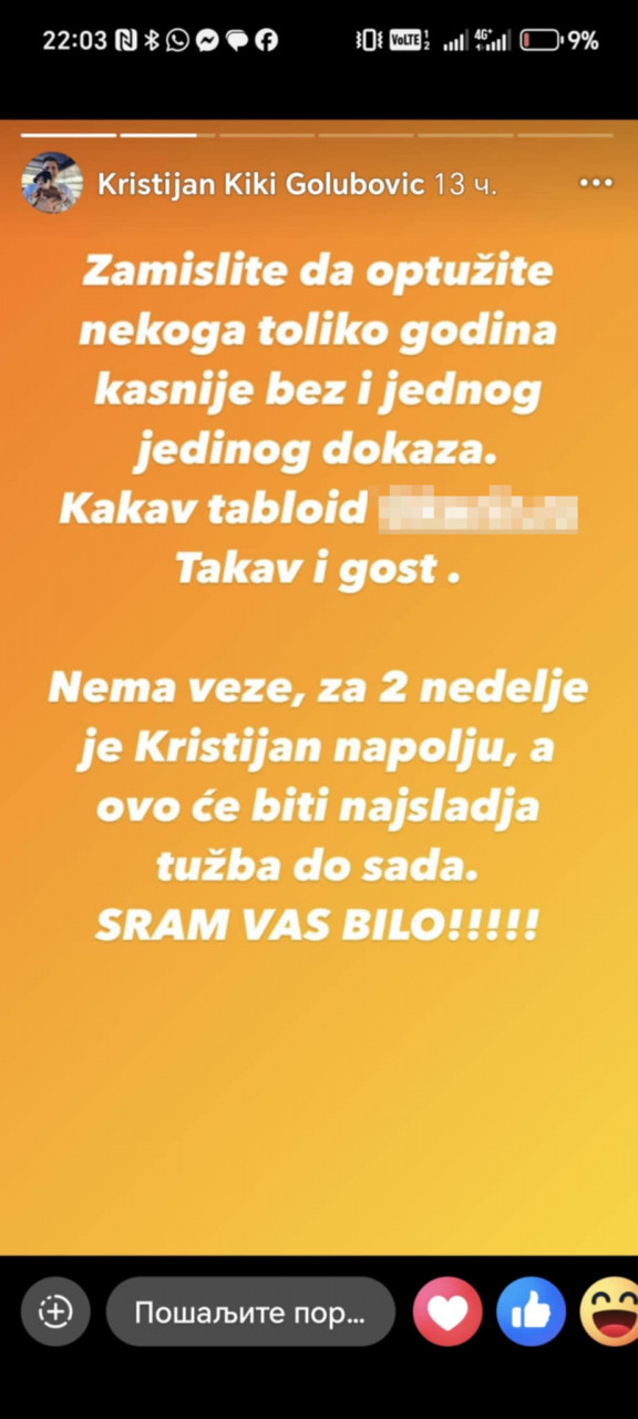 Kako je takođe navedeno na profilu, Kristijan će lično podneti tužbu protiv svih odgovornih lica i medija koji su izneli ovu neistinu, odmah po izlasku iz rijaliti formata u kojem se trenutno nalazi.