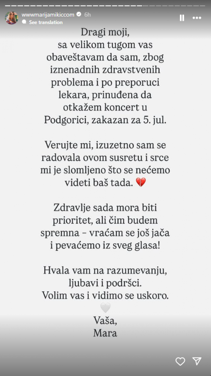 - Verujte mi, izuzetno sam se radovala ovom susretu i srce mi je slomljeno što se nećemo videti bas tada. Zdravlje sada mora biti prioritet, ali čim budem spremna – vraćam se još jača i pevaćemo iz sveg glasa! Hvala vam na razumevanju, ljubavi i podršci. Volim vas i vidimo se uskoro. Vaša, Mara - stoji u saopštenju.