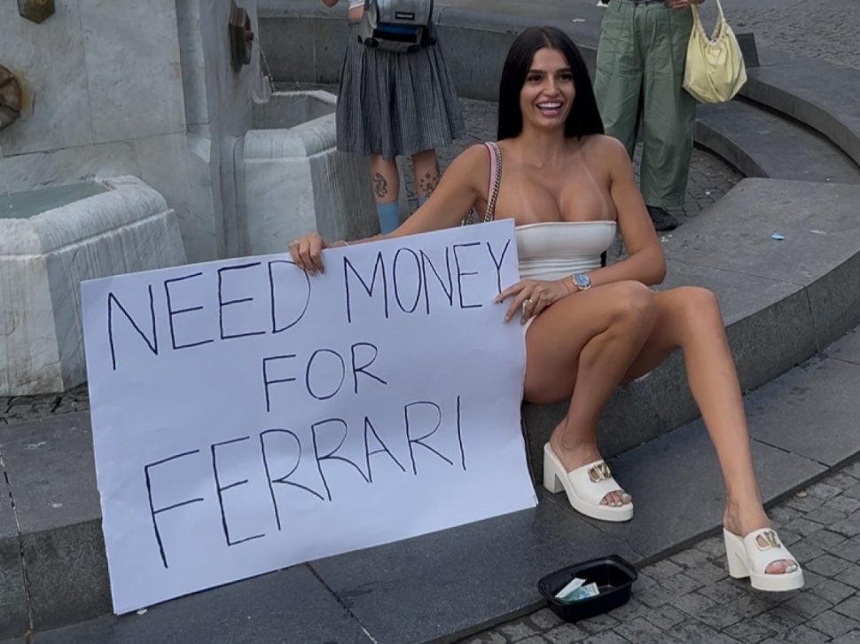 Ovoga puta, pojavila se u samom centru Beograda sa velikim transparentom na kojem je tražila novac - i to za kupovinu Ferarija.