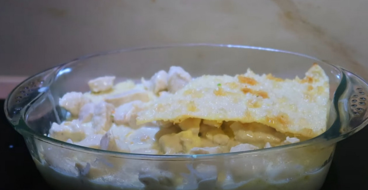 Neophodno je da rernu zagrejete na 200 stepeni. Piletinu isecite na kockice i propržite. Pavlaku dodajte u ulje i napravite sos pa ga začinite sa malo soli, bibera i suvog začina, i malo vode.Polomite mlince pa stavite u posudu i prelijte toplom vodom. Za par minuta ih ocedite. U pleh stavite pola mlinaca, pa piletinu pa pola preliva od pavlake.Onda stavite ostatak mlinaca pa prelijte pavlakom i narenađte malo sira. Pecite pola sata, u rerni zagrejanoj na 200 stepeni, sve dok ne porumeni.