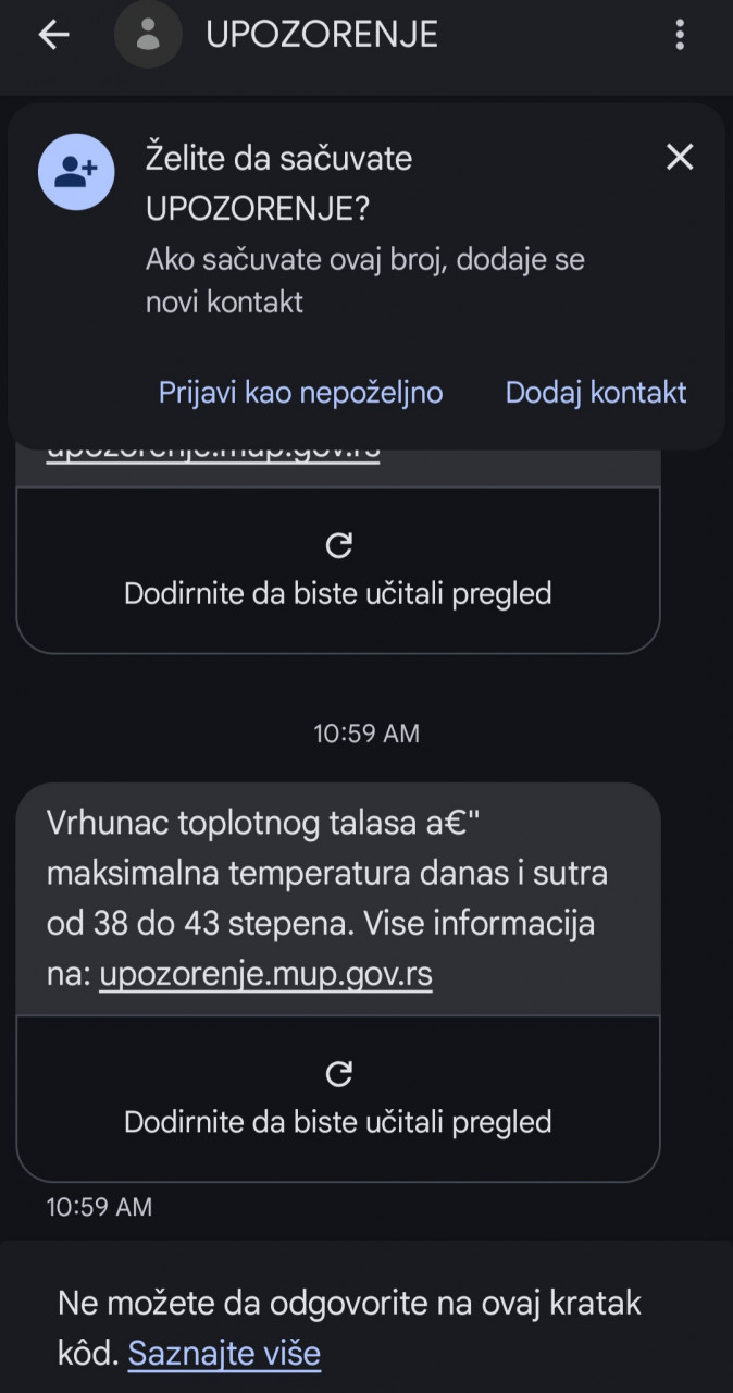 - Vrhunac toplotnog talasa, maksimalna temperatura danas i sutra od 38 do 43 stepena. Više informacija na: upozorenje.mup.gov.rs - navodi se u poruci koju je Ministarstvo unutrašnjih poslova uputilo građanima Srbije.