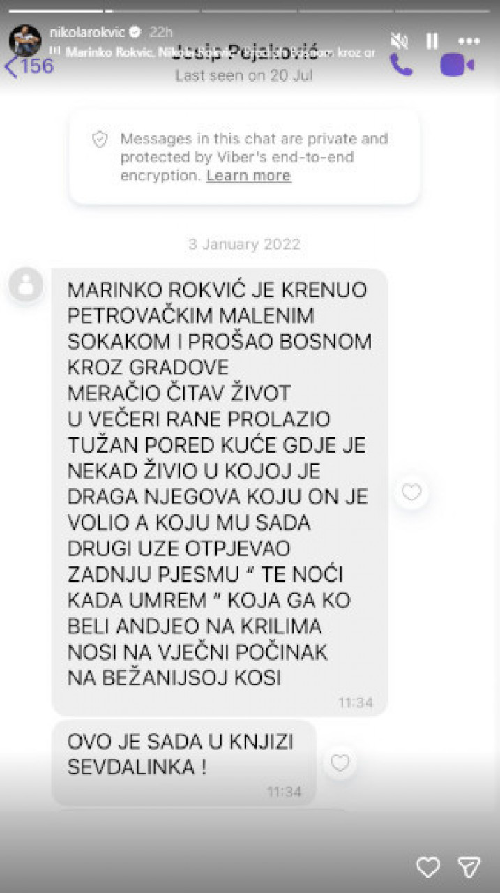 - Marinko Rokvić je krenuo Petrovačkim malenim sokakom i prošao Bosnom kroz gradove. Meračio čitav život u večeri rane prolazio tužan pored kuće gde je nekad živeo u kojoj je draga njegova koju je on voleo, a koju mu sada drugi uze. Otpevao zadnju pesmu "Te noći kada umrem" koja ga ko Beli anđeo na krilima nosi na večni počinak na Bežanijskoj kosi. Ovo je sada u knjizi Sevdalinka - stajalo je u poruci koju je Josip poslao Nikoli 2022. godine.