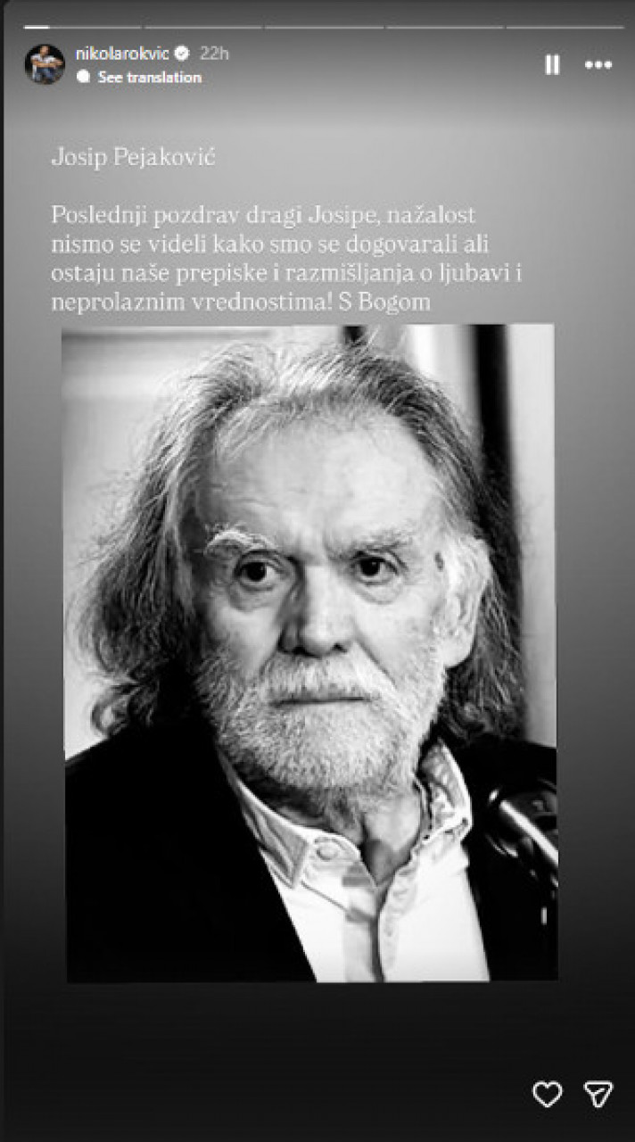 - Poslednji pozdrav dragi Josipe, nažalost nismo se videli kako smo se dogovarali. ali ostaju naše prepiske i razmišljanja o ljubavi i neprolaznim vrednostima. S Bogom - napisao je najpre, a potom je podelio i njihovu prepisku iz 2022. godine.